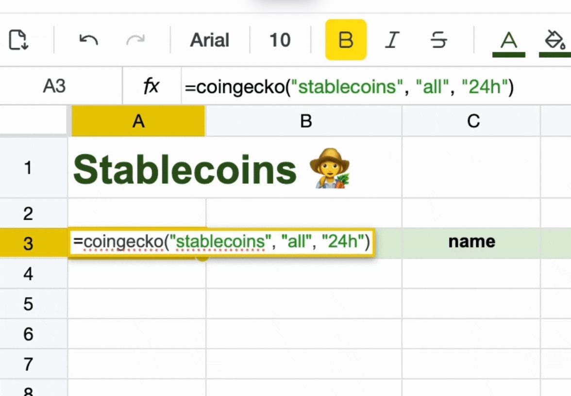 Start typing formulas like =EOA, =COINGECKO, =UNISWAP, =DEFILLAMA, =BASE and more. These formulas can let you: