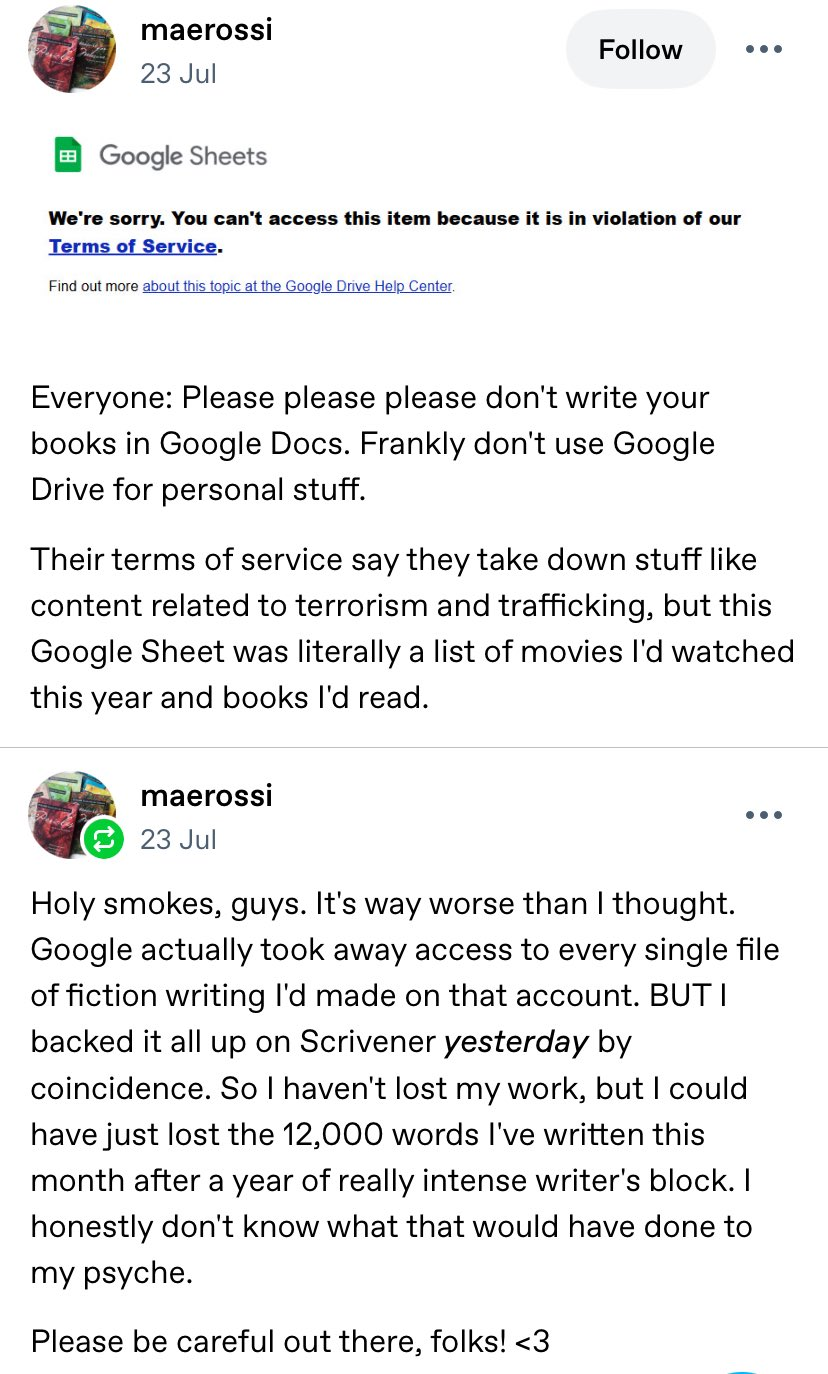 As maerossi recently shared on Tumblr, Google blocked access to all their fiction writing stored in Google Docs. Imagine the horror of seeing hundreds of hours of writing disappear...